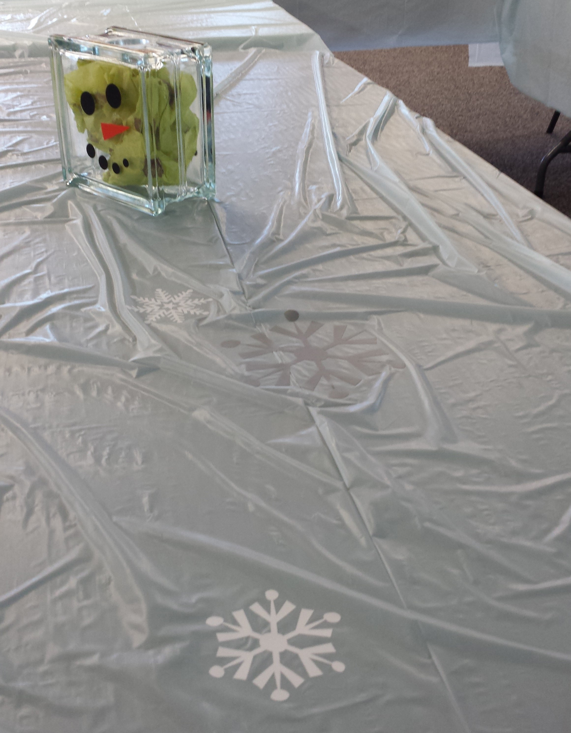 Next, I thought our table-cloths in the light blue was a perfect fit for the Winter-Theme party. But they looked a little bland... SO I used up a few excess vinyl pieces and made SNOWFLAKES decals for the table clothes. The blue table clothes were the cheap, plastic ones you find at the dollar store. The snowflakes decals were made using White and Silver vinyl sticker material. Depending on the color of the table below, each snowflake color had a spot that made them standout!