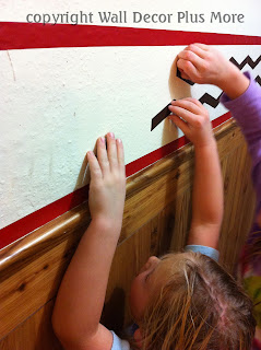 In our Blog post, we showed you the new border we applied in our entryway. But before that, we removed the Chevron stripes that were up (but never fully completed =(). Here is a picture of my girls eagerly helping...