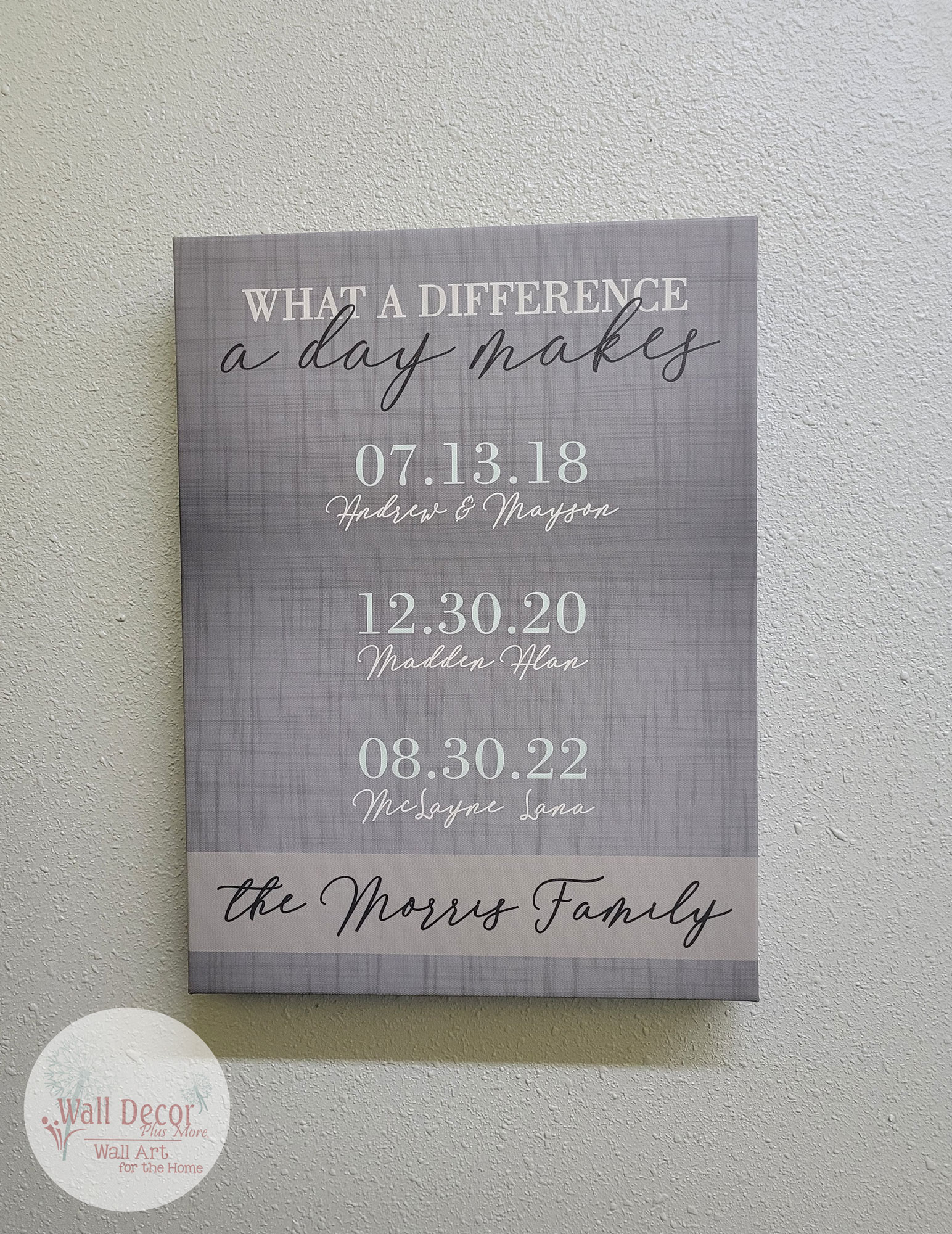 This canvas print features the quote "What a difference a day makes" at the top, custom dates and names in the center and The Family Name at the bottom.